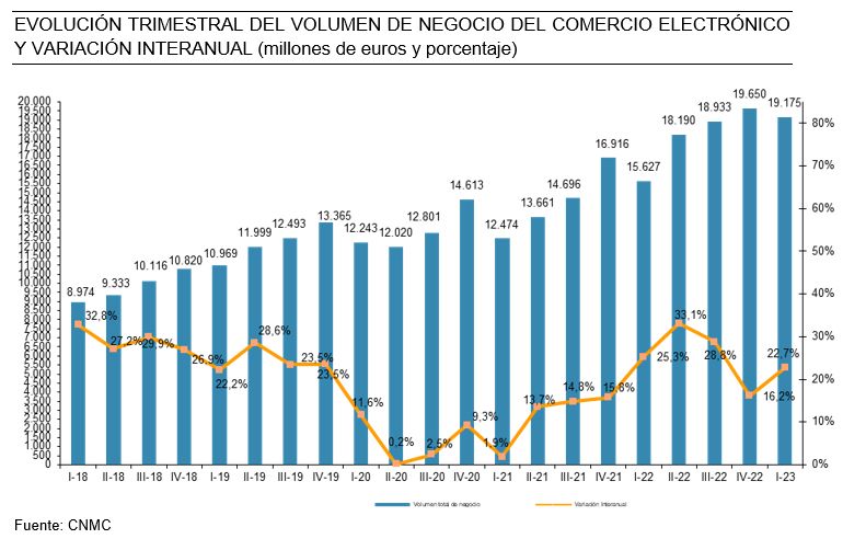 La facturación del comercio electrónico en España aumentó en el primer trimestre de 2023 un 22,7% interanual hasta alcanzar los 19.175 millones de euros, según los últimos datos de comercio electrónico disponibles en el portal CNMCData, elaborado por la Comisión Nacional de Mercados de Competencia.