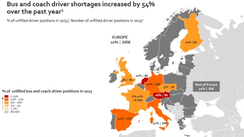 Seún el informe de la IRU, se prevé que la escasez de conductores de autobuses y autocares en Europa se duplicará con creces de aquí a 2028, ya que más de 1,2 millones de conductores de autobuses y autocares se jubilarán en los próximos cinco a diez años, mientras que la tasa de recién llegados es significativamente menor. Por lo que si no se toman medidas para atraer y retener a los conductores, Europa podría tener más de 275.000 puestos vacantes para conductores de autobuses y autocares de aquí a 2028.