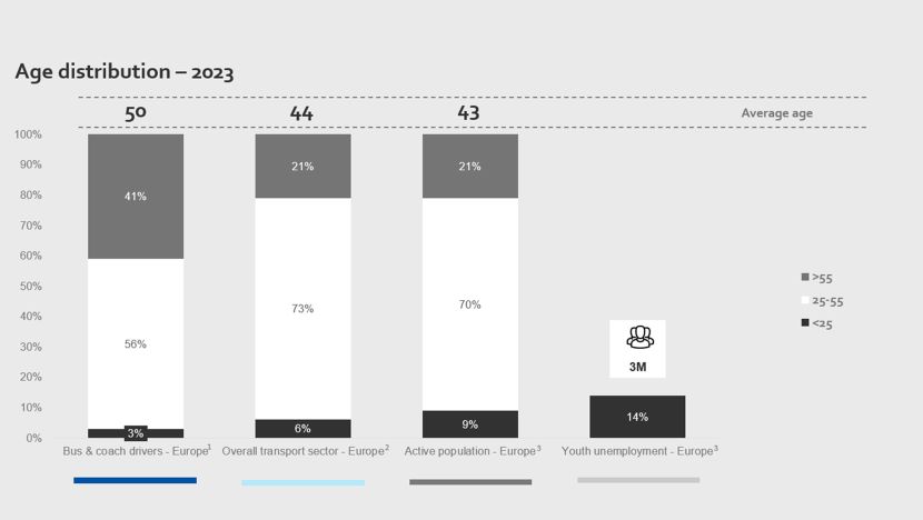 Tan sólo el 16% de los conductores de autobuses y autocares son mujeres, una cifra que está por debajo de la media de la industria del transporte (22%) y de la población activa (46%). A ello se suma que es una profesión que también tiene una población que envejece; en la actualidad menos del 3% de los conductores de autobuses y autocares en Europa tienen menos de 25 años, mientras que más del 40% tienen más de 55 años.