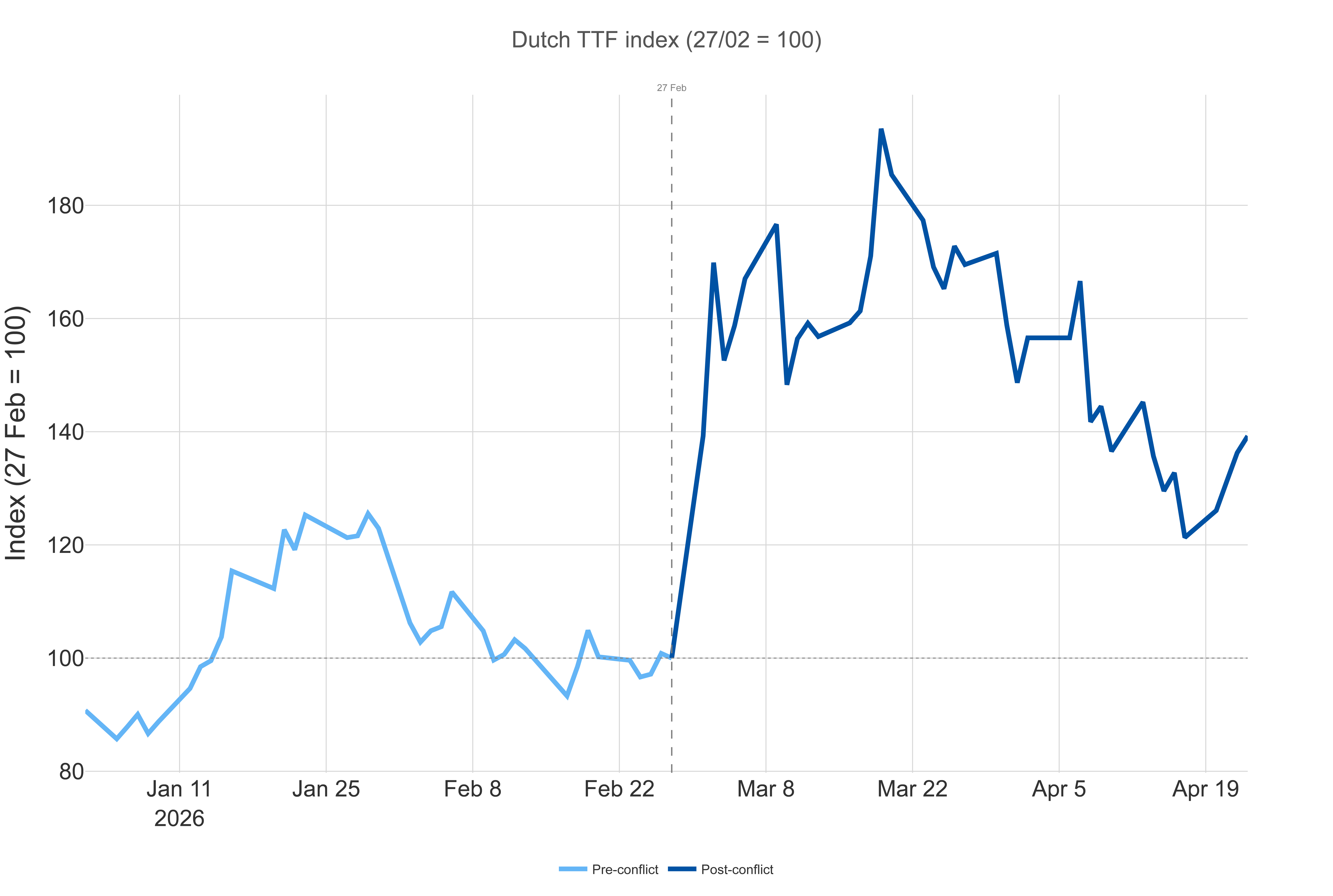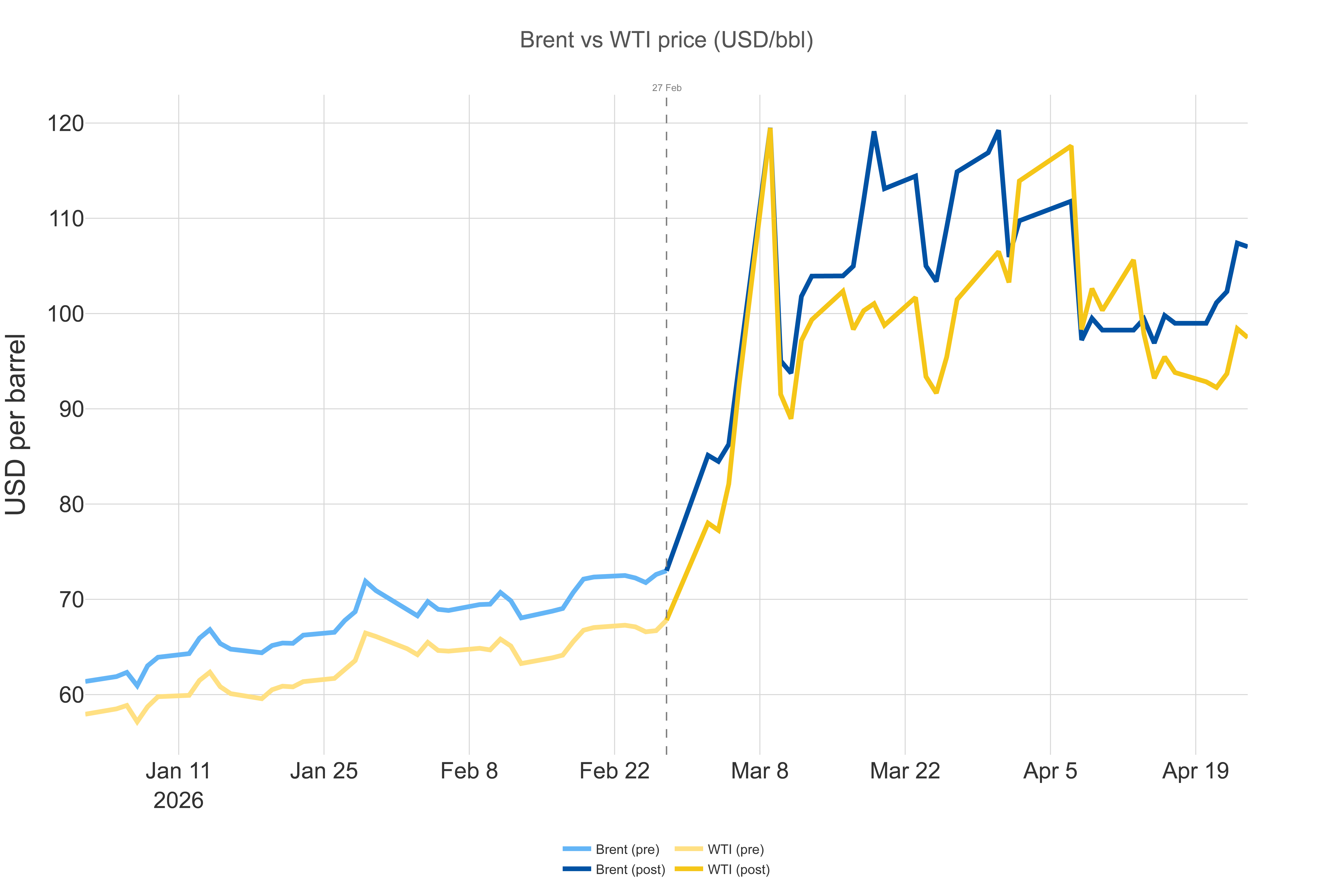 El crudo Brent cerró a 105 dólares el barril el 23 de abril, un 17% más que el mínimo posterior al alto el fuego, cercano a los 90 dólares, alcanzado el 17 de abril, y un 44% por encima del nivel de referencia de 73 dólares del 27 de febrero. El WTI, el referente estadounidense, se situó en 96 dólares el barril ese mismo día, recuperándose de los 83 dólares registrados durante el repunte del 17 de abril. Ambos índices subieron el 22 y el 23 de abril, ya que la prórroga indefinida del alto el fuego del 21 de abril no conllevó ninguna flexibilización del bloqueo del estrecho.