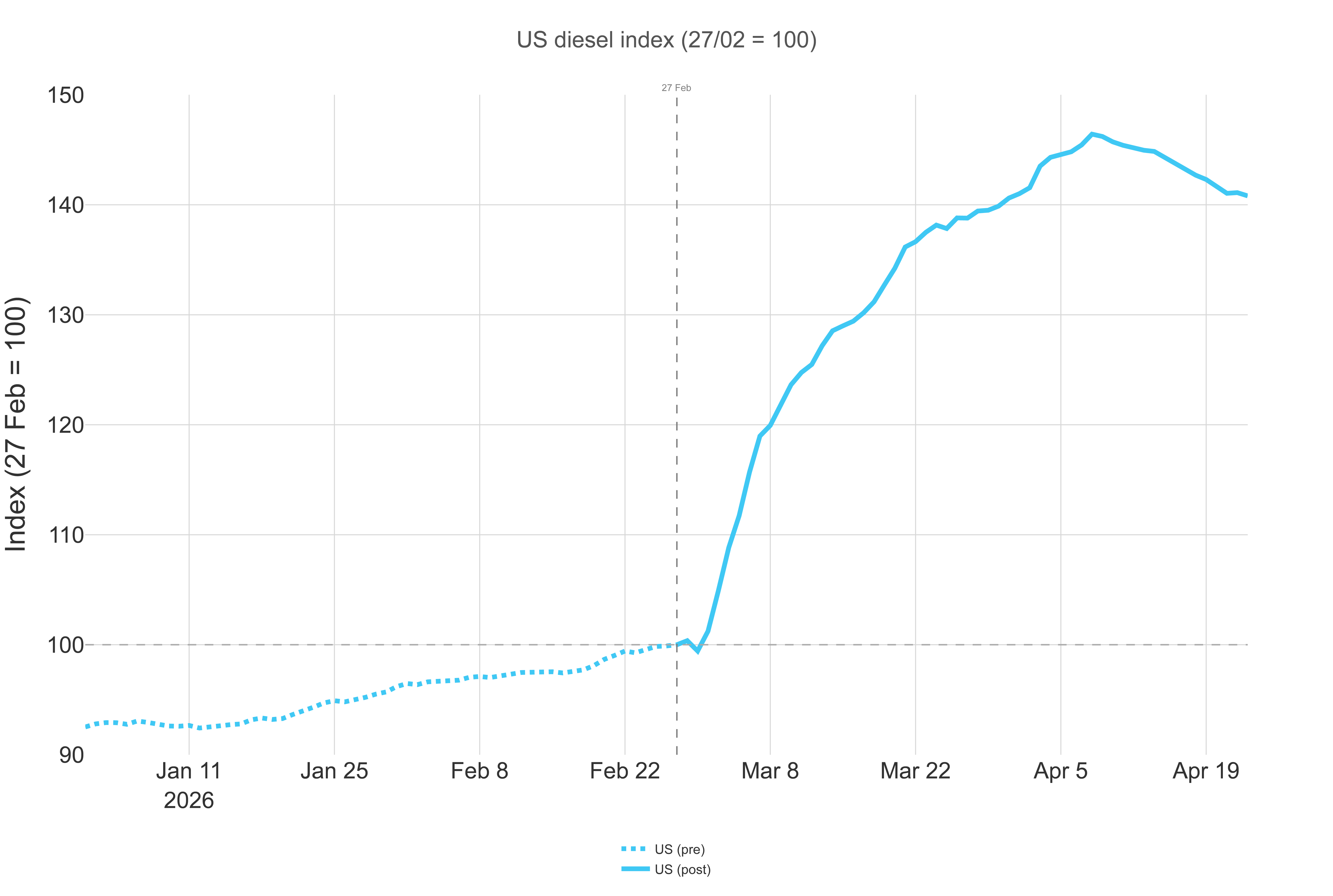 El precio medio nacional del diésel en Estados Unidos alcanzó los 1,48 dólares por litro el 23 de abril, un aumento de alrededor del 41 % desde el 27 de febrero. A pesar de la creciente presión de varios gobernadores estatales, Estados Unidos no ha suspendido ni reducido el impuesto federal especial sobre el diésel, y no existe en EE. UU. un programa de reembolso para operadores similar al europeo.