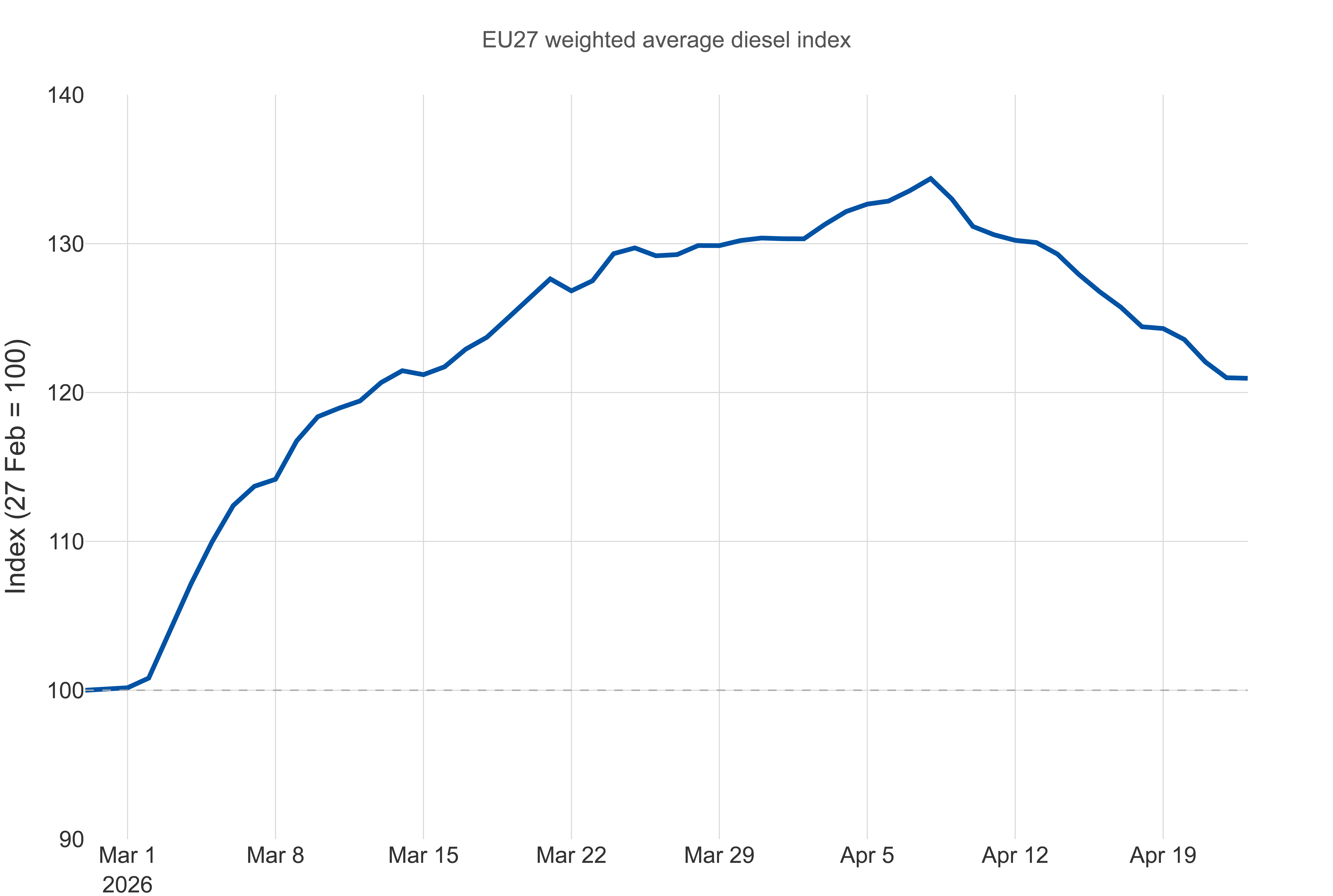 En la UE , el precio medio del diésel al por menor fue de 1,977 euros por litro, frente a los 2,07 euros del 13 de abril, lo que supone el primer descenso semanal desde principios de marzo. Sin embargo, desde que el Brent superó los 100 dólares por barril el 22 de abril, la tendencia a la baja se ha detenido y los precios se están estabilizando.