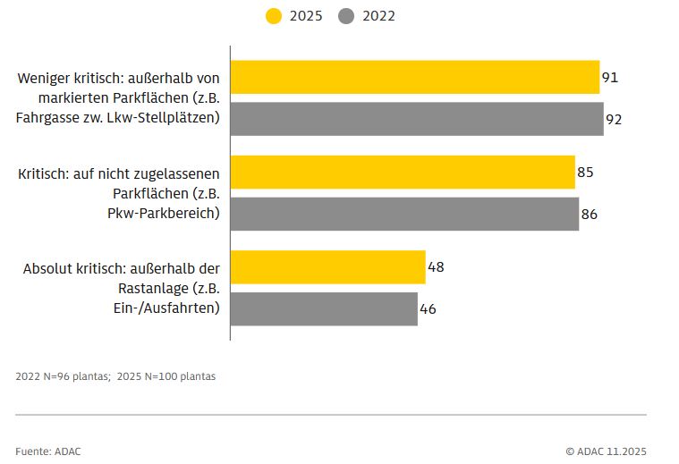 El ADAC (Automóvil Club Alemán) ha vuelto a examinar la situación en las áreas de descanso de las principales rutas de camiones de Alemania, y ha constatado en un estudio que ha publicado, que prácticamente no existen áreas de descanso sin camiones aparcados ilegalmente. Esto tiene graves consecuencias para la seguridad vial.