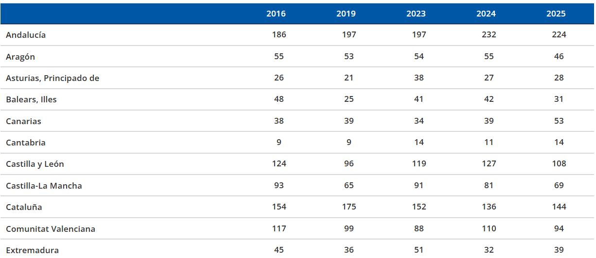 Los mayores aumentos se registran en la Comunidad Foral de Navarra con 15 fallecidos más que en 2024 y Canarias con 14 víctimas mortales más. Las mayores reducciones se han producido en Castilla y León (-19) y en la Región de Murcia y Comunidad Valenciana (-16 respectivamente).