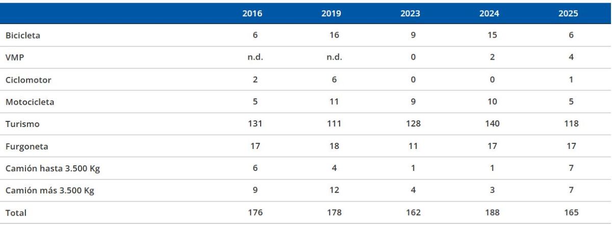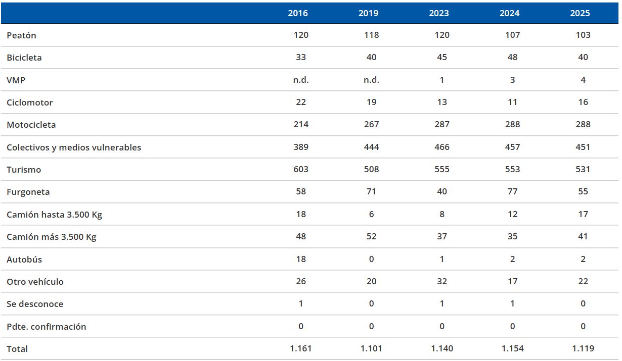 También se ha producido un descenso de fallecidos en furgoneta, con 55 víctimas mortales, 22 menos que en 2024, una cifra que vuelve a estar dentro de la horquilla habitual después de que este colectivo aumentara en 2024. Destaca también que dos personas han fallecido en autobús, demostrando que es un medio de transporte muy seguro.
