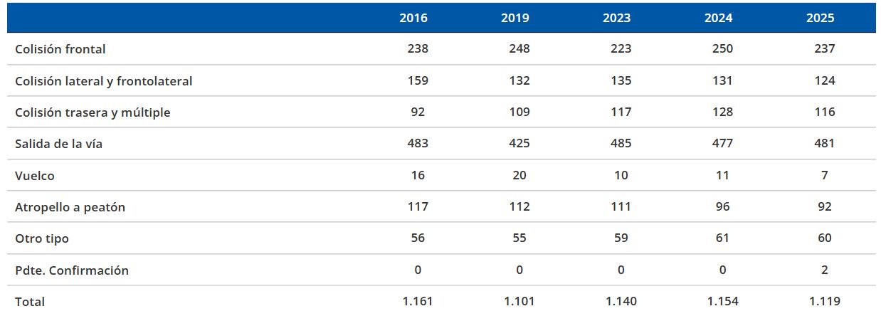 Según el tipo de siniestro, la salida de vía es el tipo de siniestro con mayor número de personas fallecidas (481) representando el 43 por ciento del total, cifras similares a las del año anterior. Por su parte, las colisiones frontales concentran el 21 por ciento de las personas fallecidas (237), una disminución del 5 por ciento (-13) respecto al 2024.
