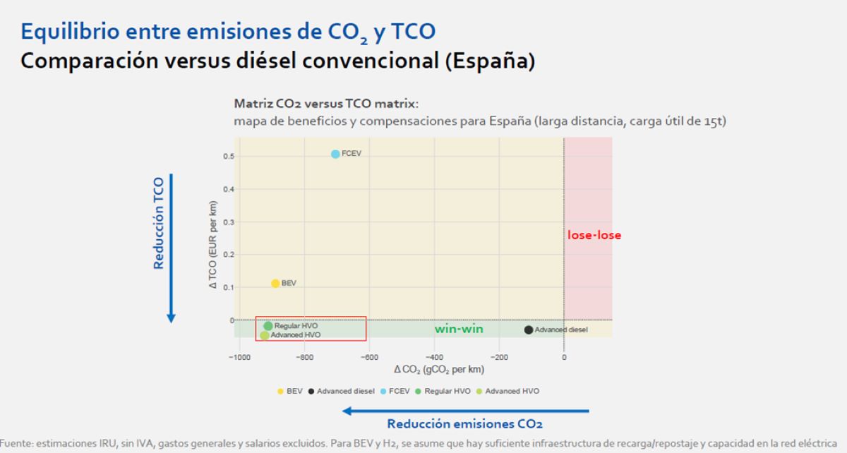 La opción energéticamente más eficiente y económicamente más competitiva para el sector español del transporte pesado por carretera es mantener los motores de combustión modernos de los camiones alimentados con HVO (Aceite Vegetal Hidrotratado). Es la principal conclusión del informe ‘Coste Total de Propiedad (TCO) y emisiones de CO2 en España: camiones diésel y alternativos en 2025’, que acaban de presentar en España la Organización Internacional del Transporte por Carretera (IRU) y la Asociación del Transporte Internacional por Carretera (ASTIC), miembro de pleno derecho de IRU y responsable de aportar los datos sobre la situación específica de este sector en nuestro país.
