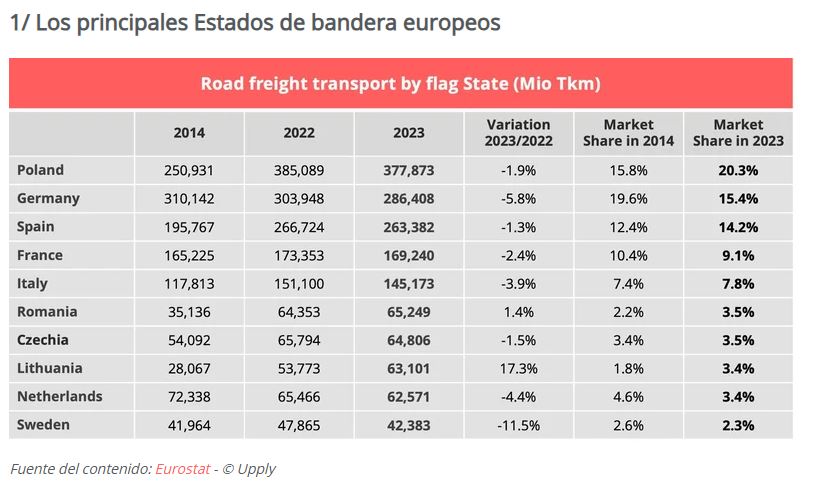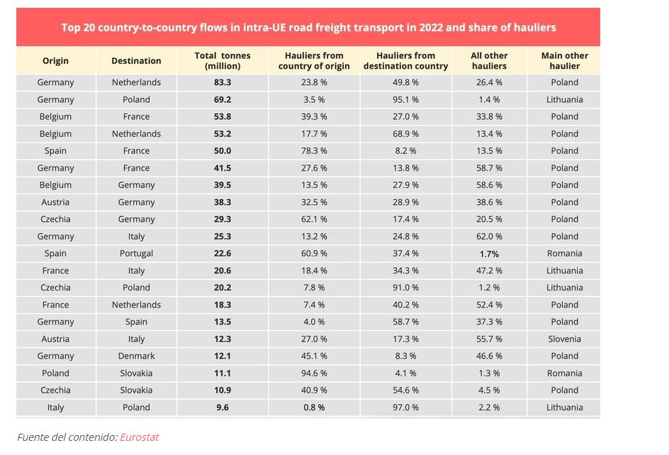 El transporte internacional por carretera en la UE-27 representó 719 100 millones de toneladas-kilómetro en 2023, lo que supone un descenso del 3 % en comparación con el año anterior. El Top 5 representa el 64,8 % del tráfico, frente al 60,7 % en 2019.