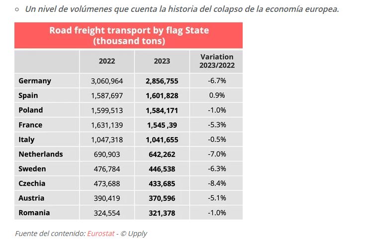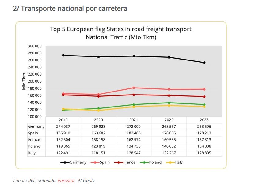 Tras registrar un ligero descenso del 0,1% en 2022, el transporte nacional por carreter , que representa el 61,3% de la actividad global de la Unión Europea, continuó su descenso. En 2023, disminuyó un 3,3%, hasta 1,138 billones de toneladas-kilómetro. El Top 5 representa el 75% de los volúmenes. Tradicionalmente, incluye a las principales economías europeas, que tienen un gran mercado de producción y consumo.