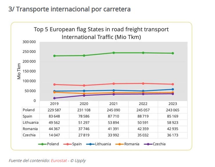 - Por otra parte, la flota registrada en Lituania está recuperando impulso después de una caída en 2022. El tráfico internacional aumentó un 16,5% el año pasado, impulsado por la actividad de comercio cruzado que aumentó un 19% hasta los 41.200 millones de tkm y la actividad de cabotaje que aumentó un 20% hasta los 6.800 millones de tkm.