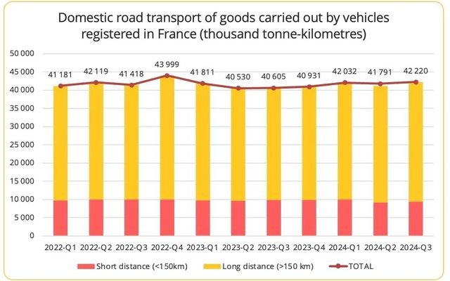 En el segundo trimestre de 2024, la actividad de transporte de mercancías por carretera nacional realizada por vehículos matriculados en Francia, en datos ajustados por variaciones estacionales y de calendario, alcanzó los 41.800 millones de toneladas-kilómetro, lo que supone una caída del 0,8% con respecto al trimestre anterior. Esta cifra también muestra un claro aumento interanual, con un crecimiento del 4,5% con respecto al tercer trimestre de 2023.