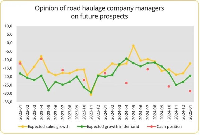 En diciembre de 2024 y enero de 2025, las previsiones de evolución de la facturación y de la demanda en el transporte de mercancías por carretera volvieron a mejorar, pero también en este caso se mantienen muy por debajo de la media. Los transportistas encuestados señalan claramente la falta de demanda como el principal factor limitante.