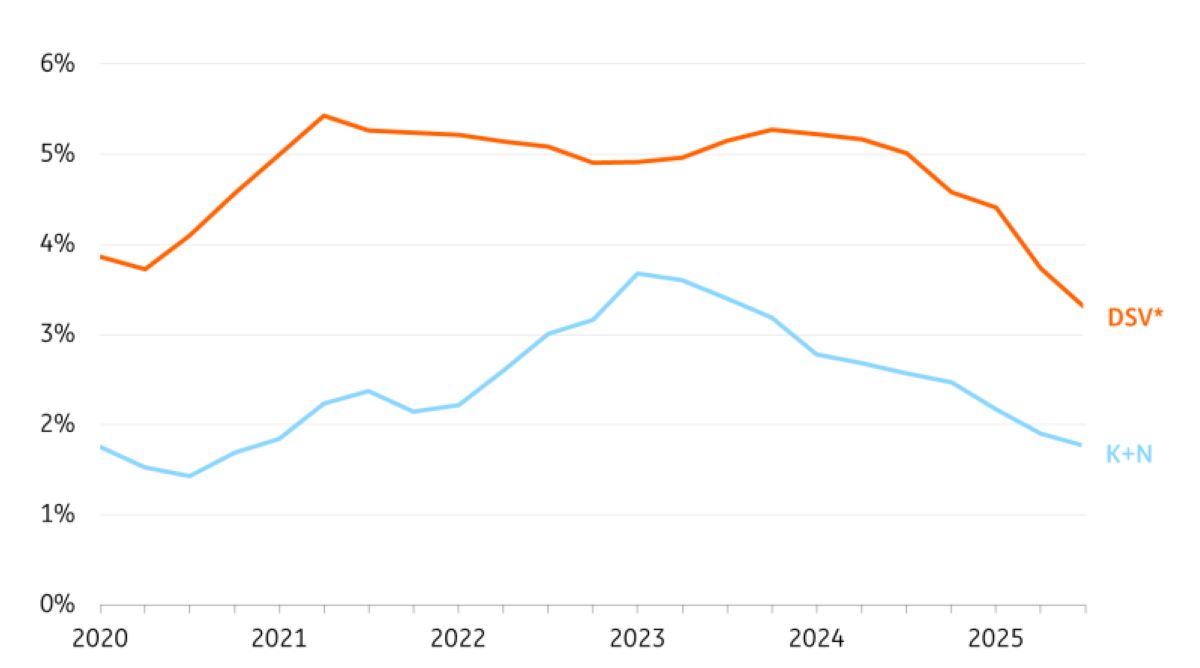 EBIT divisiones de transporte por carretera DSV + Kühne & Nagel (centradas principalmente en Europa), promedio móvil de cuatro trimestres.