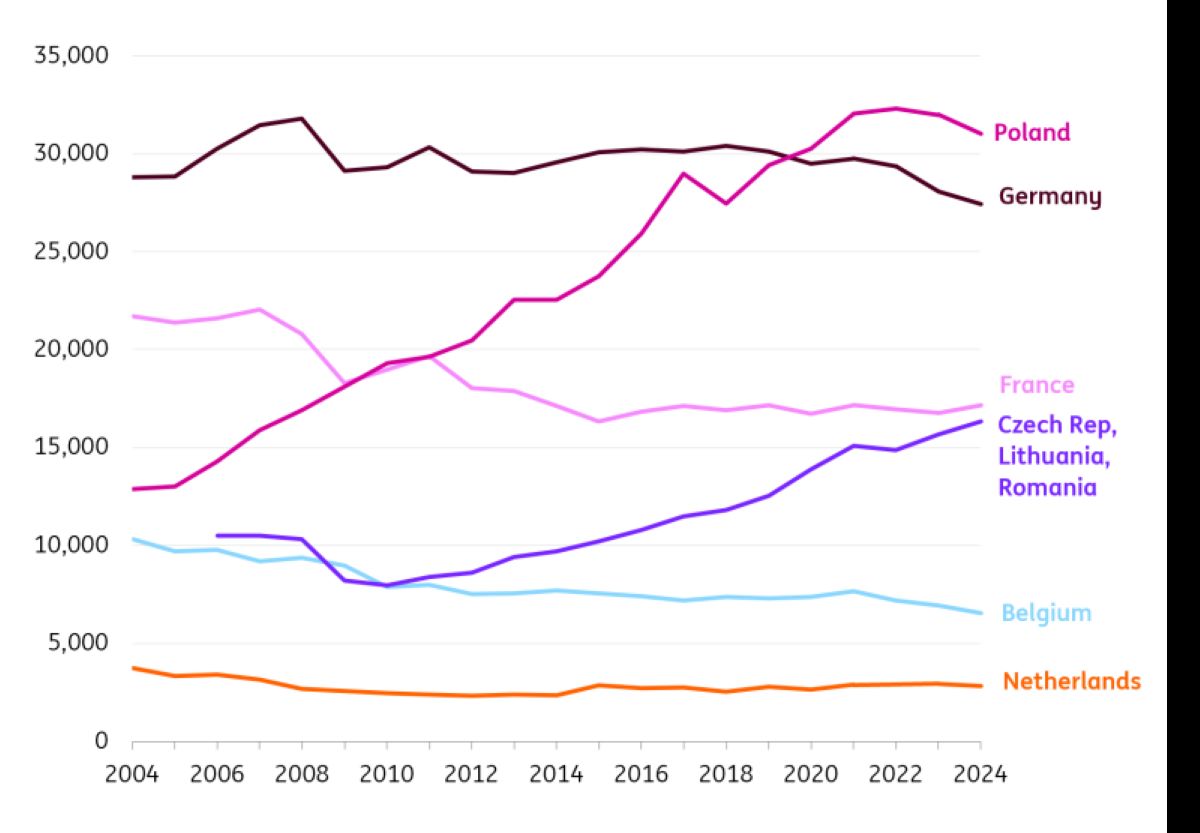 Desde la importante ampliación de la UE en 2004, el transporte internacional por carretera se ha desplazado cada vez más hacia Polonia debido a los menores costes laborales. Esto ha reducido la actividad de transporte desde los Países Bajos, Bélgica, Alemania y Francia, mientras que Polonia se ha convertido en el líder del mercado. La cuota de la flota neerlandesa en kilómetros internacionales se redujo del 60 % a poco más de un tercio, y la disminución del kilometraje de los tractores matriculados en los Países Bajos demuestra que la tendencia persiste.