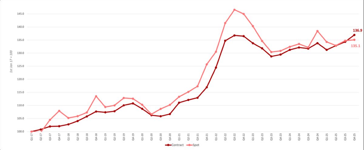 Tanto las tarifas contractuales como las al contado continuaron subiendo en el cuarto trimestre de 2025. En noviembre de 2025, el volumen del comercio minorista aumentó un 2,3 % interanual tanto en la eurozona como en la UE, según Eurostat, tras un crecimiento revisado del 1,9 % en octubre. Esta demanda sostenida de los consumidores explica el repunte de las tarifas contractuales, ya que las empresas prevén una mayor demanda en los próximos meses y están cerrando contratos.
