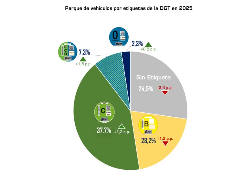 La radiografía del etiquetado medioambiental muestra una mejora lenta pero constante. Los vehículos sin distintivo ambiental han descendido un 7,8%, situándose en 7,75 millones de unidades. Sin embargo, todavía representan el 24,5% del parque móvil.