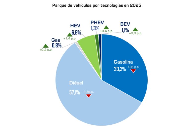 En cuanto a la propulsión, el diésel mantiene su hegemonía con 18.098.867 unidades (57,1% del parque), a pesar de un ligero descenso del 1,8%. Los vehículos de gasolina representan el 33,2%. La nota destacada la ponen los electrificados (PHEV y BEV), que ya suman 746.510 unidades y aumentando su presencia hasta el 2,4% del parque total, siendo en su mayoría turismos.