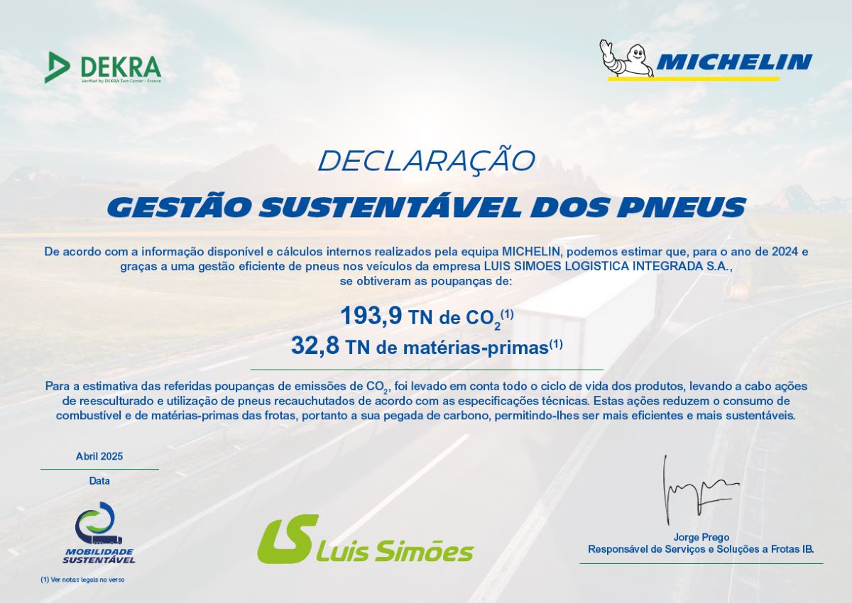 Luís Simões, operador logístico y de transporte de mercancías por carretera de referencia en la Península Ibérica recibe la Declaración de Gestión Sostenible de Michelin, una distinción que avala la gestión eficiente de neumáticos y su consecuente reducción de emisiones y recursos utilizados.