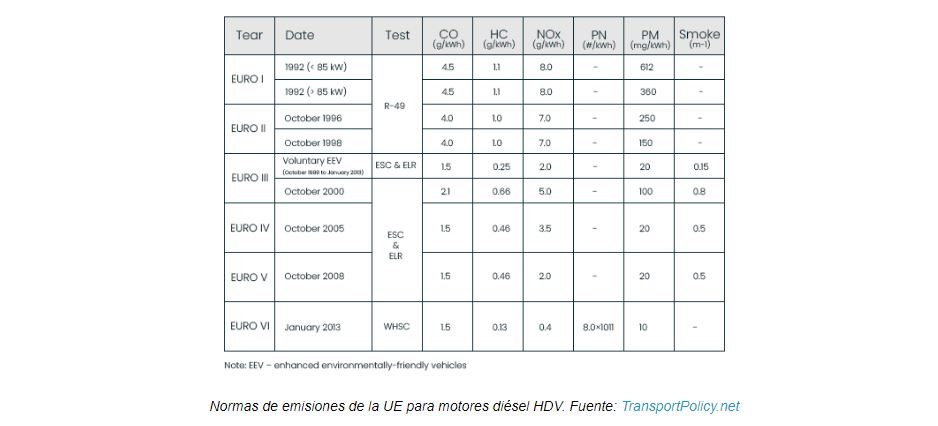 - Requisitos OBD más estrictos (que Euro IV – V) y límites aún más estrictos para las emisiones de NOx, HC, PM, así como de amoníaco (NH3) y dióxido de nitrógeno (NO2).