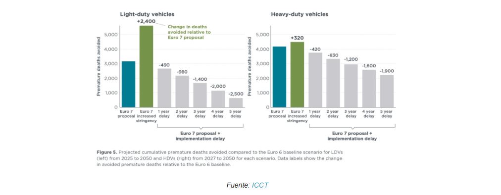 Según un estudio de 2021 del Consejo Internacional de Transporte Limpio (ICCT) , las reducciones de las emisiones de NOx del tubo de escape a partir de la norma Euro 7 podrían “prevenir 35.000 muertes prematuras y evitar 568.000 años de vida perdidos durante el período 2027-2050″».