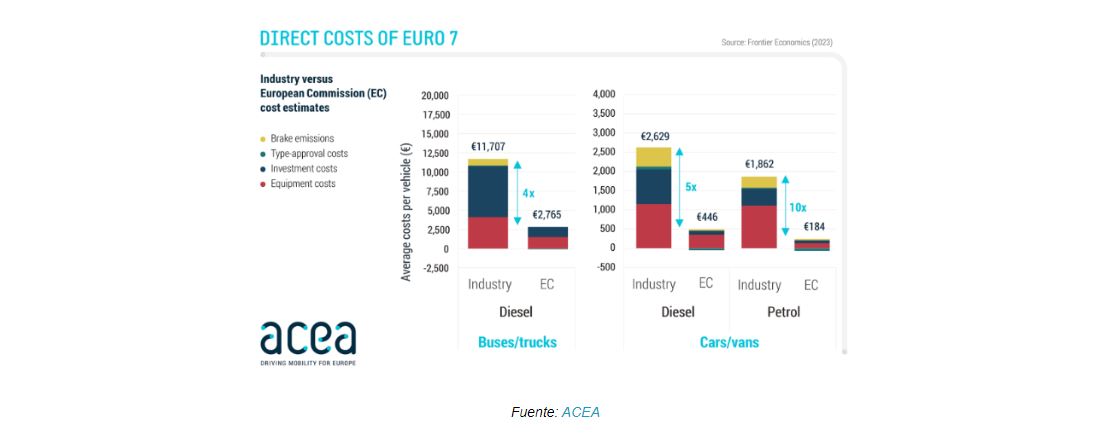 Según el análisis de ACEA , los costes directos de la aplicación de Euro 7 serían entre cuatro y diez veces superiores a los que estima la Comisión en su evaluación de impacto de Euro 7. La organización señala un estudio de Frontier Economics , que concluyó que los costes directos incrementales medios de los vehículos Euro 7 (en comparación con los Euro 6/VI) están impulsados en gran medida por los costes de equipamiento y de inversión y ascienden a unos 2.000 euros para los turismos y furgonetas con un sistema interno. motor de combustión, y 12.000 € para camiones y autobuses diésel.