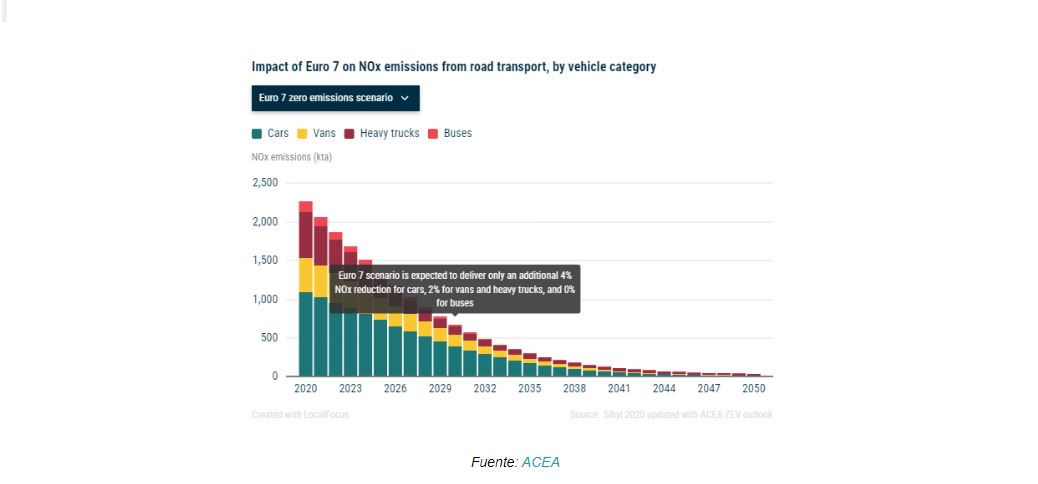 “La propuesta Euro 7 sólo reduciría las emisiones de NOx del transporte por carretera en menos del 4% para los turismos y furgonetas (en comparación con los niveles Euro 6) y alrededor del 2% para los camiones. Pero requerirá importantes recursos humanos y financieros. Sin abordar los vehículos más antiguos, Euro 7 tendrá un impacto apenas perceptible en las emisiones de NOx del transporte por carretera»», afirma en su hoja informativa la organización, que representa a los 14 mayores fabricantes de automóviles europeos.