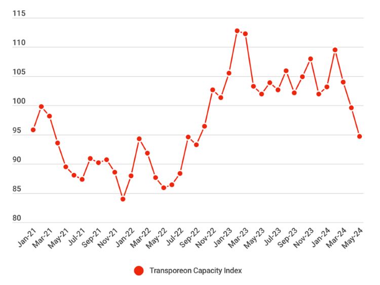 El índice europeo de capacidad de transporte de mercancías por carretera disminuyó por quinto mes consecutivo, cayendo un -7,0% interanual en mayo de 2024, según los últimos datos de Transporeon.