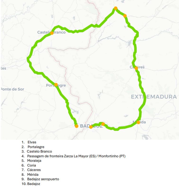 El proyecto contempla una línea circular internacional, compuesta por dos rutas con frecuencias diarias en ambos sentidos, entre poblaciones extremeñas y portuguesas. Incluye, además, una conexión reforzada con el Aeropuerto de Badajoz, adaptada a los momentos de mayor demanda de transporte. En suma, se trataba de aprovechar el cabotaje en rutas internacionales para mejorar la conectividad interna de la región.