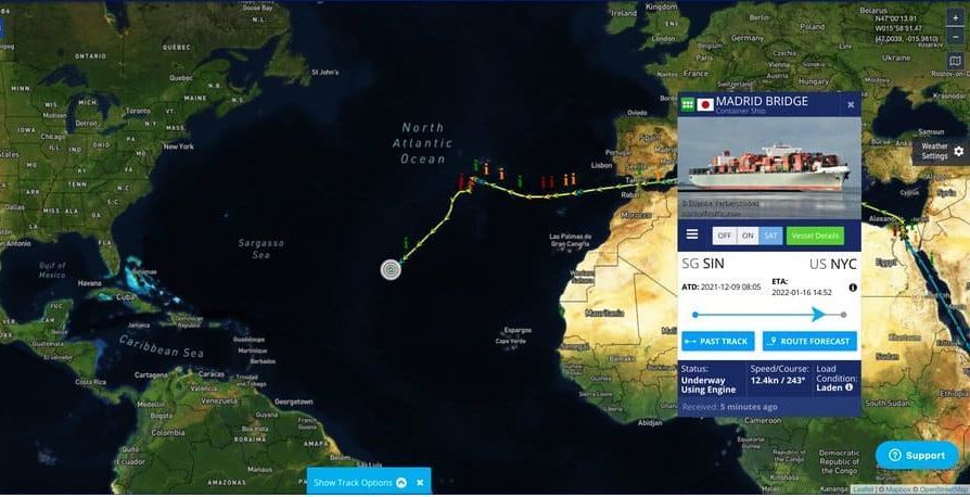 El barco que transporta 13.900 teus, en el servicio EC4 de la compañía desde Asia a la costa Este de EE. UU., sufrió el colapso de la chimenea en el Atlántico medio y actualmente viaja a 19 nudos, según datos de AIS en Vessels Value. El Puente de Madrid se ha desplazado hacia el sur, y estaba al noreste del Caribe, para sortear una tormenta, que originalmente se pensaba que se dirigía a Nueva York.