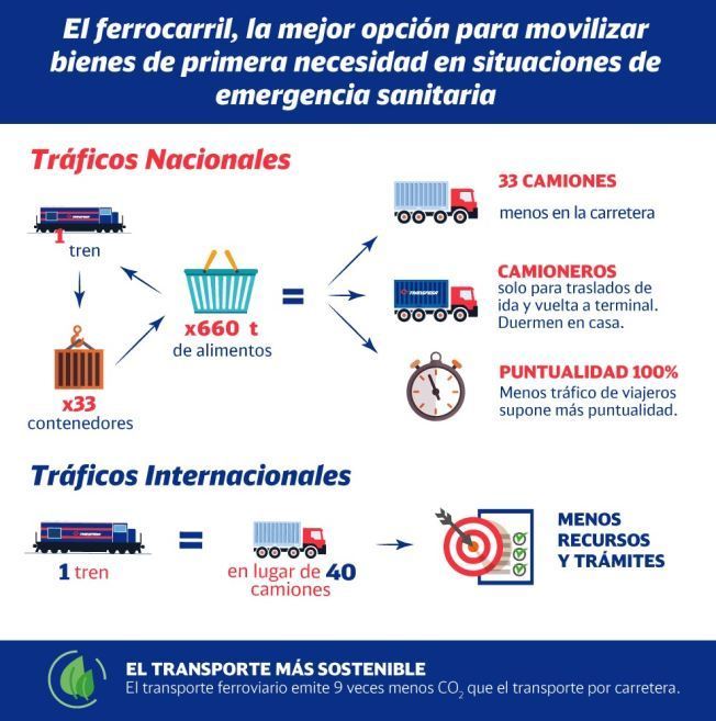 El transporte de mercancías por ferrocarril cobra un especial protagonismo en el actual estado de alarma y confinamiento para combatir el COVID-19. Este medio se ha convertido en un modo esencial para movilizar bienes de primera necesidad y equipos sanitarios para la población (artículos de alimentación, medicamentos, material de protección, camas y equipamientos para hospitales e instalaciones de campaña, etc.).
