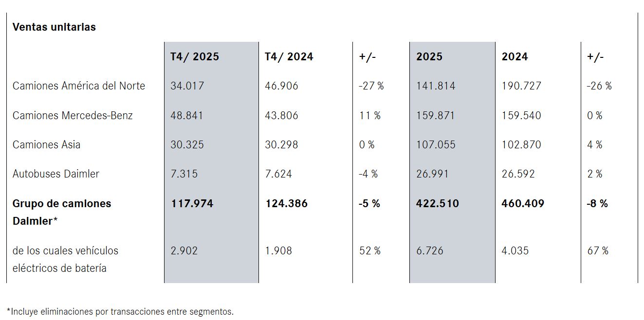 Daimler Truck cerró el ejercicio 2025 con su mejor trimestre en ventas de unidades, totalizando 422.510 camiones y autobuses a nivel de Grupo (2024: 460.409). El segmento Trucks North America contribuyó con 141.814 unidades a las ventas totales del Grupo (2024: 190.727). Con 159.871 unidades vendidas, Mercedes-Benz Trucks alcanzó el nivel del año anterior (2024: 159.540).
