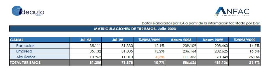 Raúl Morales, director de comunicación de FACONAUTO, indicaba que: «lo más importante del dato de matriculación de vehículos del mes de julio es que crece, y ya son siete meses consecutivos de crecimiento en el mercado. Aun así, estamos un 30% por debajo de lo que hacíamos en el año 2019, pero, insistimos, lo más relevante es que el mercado siga sumando crecimientos y que no dé muestras de debilidad. De cara al segundo semestre del año, nuestra previsión es que estos crecimientos en las ventas de vehículos se mantengan porque parece que el contexto económico y de consumo nos van a favorecer. Pero para ello también es muy importante que nos acompañe el contexto político y es esencial que se forme cuanto antes un gobierno estable, que dé certidumbre a los compradores».