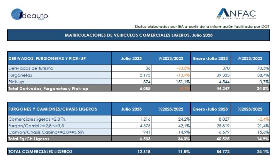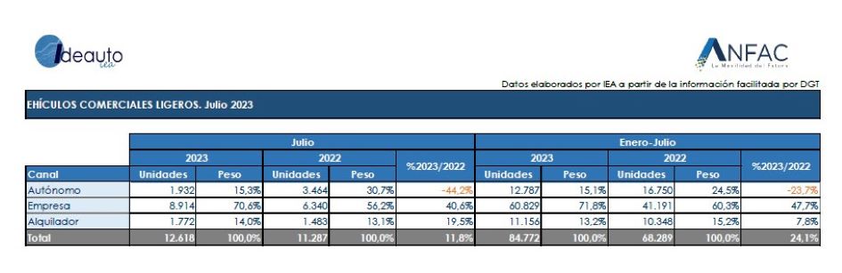 Las matriculaciones de vehículos comerciales ligeros mejoran en el séptimo mes con 12.618 unidades, un aumento del 11,8% respecto al año pasado. Hasta julio, las ventas siguen creciendo, con un total de 84.772 unidades, un 24,1% más. Por canales, tanto empresas como alquiladores logran crecer un 40,6% y 19,5%, respectivamente, pero las ventas dirigidas a autónomos sufren un fuerte retroceso del 44,2% en julio.