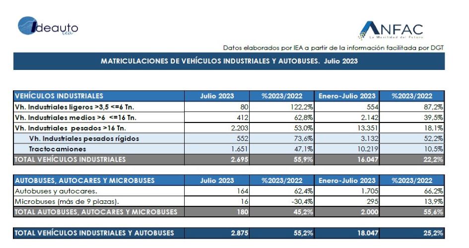 En julio, las matriculaciones de vehículos industriales, autobuses, autocares y microbuses registran un notable crecimiento del 55,2, en comparación con el mismo mes del año pasado, con 2.875 ventas en el mes. En el total del año, se suman 18.407 unidades vendidas, que representan un crecimiento del 25,2% respecto al mismo periodo de 2022. Por tipología, los vehículos industriales registran 2.695 nuevas ventas, mejorando un 55,9% en julio. De igual manera, las ventas de autobuses, autocares y microbuses crecen un 45,2%, con 180 unidades matriculadas.