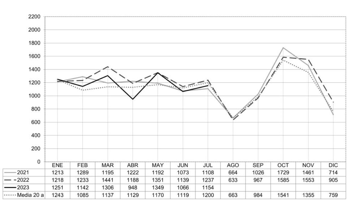 Se mantiene la tendencia del mes anterior y de la media de los primeros siete meses del año con un -6,7%. No es un mal resultado teniendo en cuenta la situación de inflación, financiación cara, malas cosechas, retraso de las nuevas masas y dimensiones y distorsión por el tacógrafo.