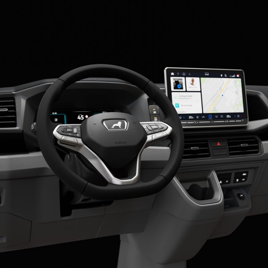 Otros puntos destacados del salpicadero son el volante multifunción ergonómico rediseñado con palanca de cambio integrada en la columna de dirección (para transmisiones automáticas), el freno de estacionamiento electrónico y la función Keyless Go. Estos nuevos elementos hacen que el día a día sea más eficiente y agradable para el conductor de la TGE, a lo que también contribuyen los portavasos, los compartimentos portaobjetos y el compartimento para el teléfono móvil con función de carga inductiva.