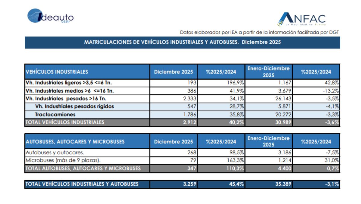 Las matriculaciones de vehículos industriales, autobuses, autocares y microbuses en el mes de diciembre han disminuido un 45,4%, con 3.259 unidades vendidas. Aunque las cifras de diciembre son positivas, en 2025 las ventas no logran aumentar y alcanzan las 35.389 nuevas unidades, un 3,1% por debajo de 2024, según los datos facilitados por la Federación de Asociaciones de Concesionarios de la Automoción (Faconauto).