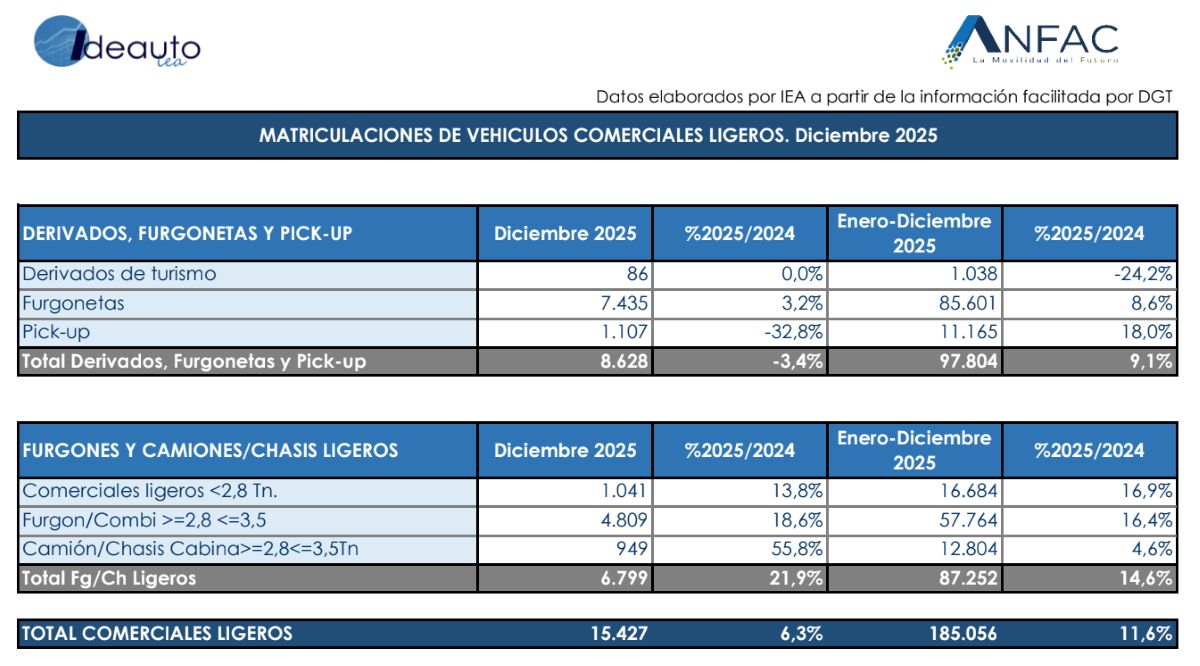 Respecto a los vehículos comerciales ligeros, se matricularon 15.427 unidades en diciembre, lo que representa una subida del 6,3% respecto al mismo periodo del año pasado. En el acumulado del año, se registra un total de 185.056 ventas, un incremento anual del 11,6%. Del total de las ventas, 8.628 unidades corresponden al segmento derivados, furgonetas y pick-up; y 6.799 a furgones y camiones/chasis ligeros.