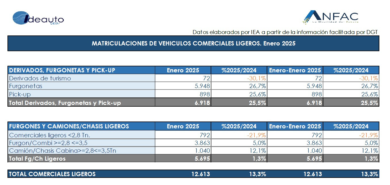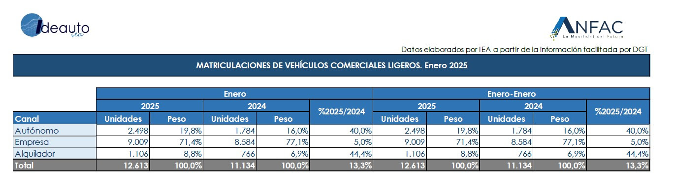 Las matriculaciones de vehículos comerciales ligeros aumentan un 13,3% en enero, con 12.613 unidades. Por canales en el primer mes, todos logran crecer. Las ventas a autónomos logran 2.498 unidades, un 40% más. Mientras que alquilador alcanza las 1.106 unidades, con un aumento del 44,4%. En menor medida, pero también en positivo, las empresas venden un 5% más, con 9.009 ventas.