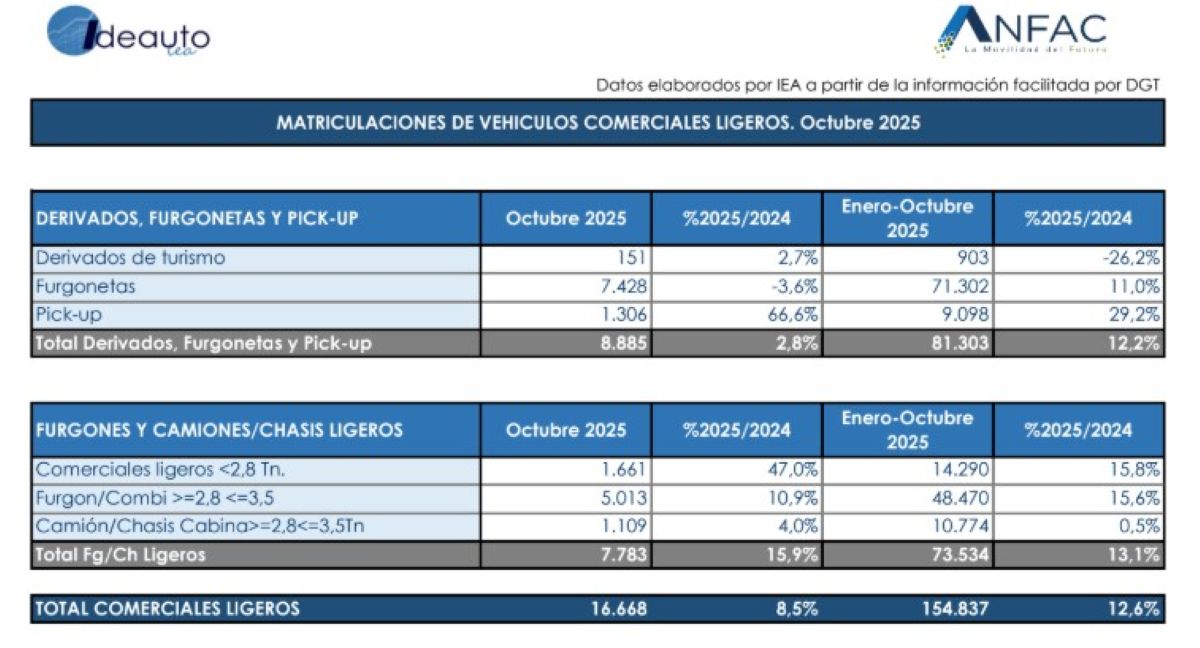 Respecto a los vehículos comerciales ligeros, se matricularon 16.668 unidades en octubre, lo que representa una subida del 8,5% respecto al mismo periodo del año pasado. En el acumulado del año, se registra un total de 154.837 ventas, un incremento del 12,6%. Del total de las ventas, 8.885 unidades corresponden al segmento derivados, furgonetas y pick-up; y 7.783 a furgones y camiones/chasis ligeros.