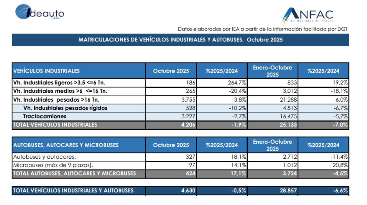 Por tipo de vehículos, en el mes de octubre se matricularon 4.206 industriales con una reducción en sus ventas del 1,9% respecto a las 4.289 unidades del mismo mes de 2024. En el acumulado de enero a octubre se han vendido 25.133 vehículos, representando un descenso del 7% en relación al mismo periodo del año pasado, con 27.014 matriculaciones.