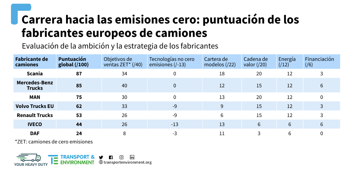 Scania encabeza la clasificación de ambición y estrategias climáticas de los fabricantes de camiones. Aunque sólo tiene el objetivo de que el 50% de sus ventas sean eléctricas o de hidrógeno en 2030, cuenta con una estrategia industrial muy sólida. Mercedes-Benz Trucks, en segundo lugar, aspira a que el 60% de sus ventas sean vehículos de emisiones cero en 2030. Sin embargo, hay un desfase entre sus anuncios y sus planes industriales ya que tiene una estrategia de baterías más débil y aún tiene que asegurarse el suministro de materias primas para baterías. En cuarto lugar, MAN planea una gama más reducida de modelos eléctricos y tiene un objetivo más débil de emisiones cero para 2030.