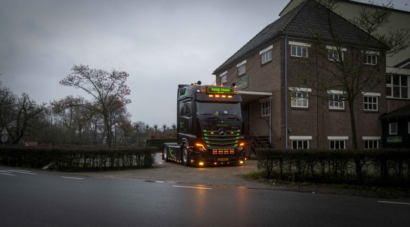 El nuevo Actros de Pegie Trans, acabado en negro con letras verdes, se ha convertido en un camión de excepcional calidad. Paul Leerkes, vendedor de camiones de Wensink, afirma: “No vemos todos los días un Actros con un equipamiento tan lujoso. Una pequeña selección de las numerosas opciones: este tractor de 530 CV viene de fábrica con suspensión totalmente neumática y está equipado, entre otras cosas, con calefactor auxiliar y aire acondicionado, asientos y volante tapizados en cuero, el amplio paquete de atmósfera LED y estrella iluminada. , sistema de sonido de lujo, iluminación LED en todas partes y las muy buscadas y elegantes llantas Alcoa Dura Bright. Esta es una combinación de opciones cómodas y elegantes con la que sueña todo camionero. Y ciertamente no terminó ahí, porque la construcción de este camión también es una historia diferente»».