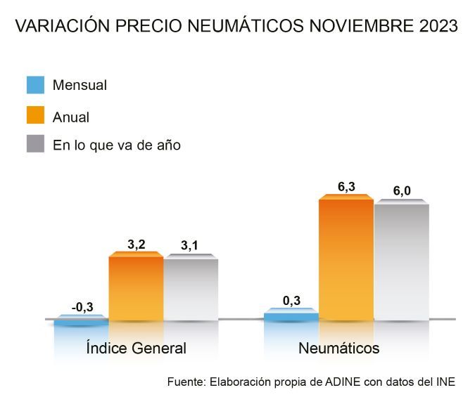 Según un estudio elaborado por la Asociación Nacional de Distribuidores e Importadores de Neumáticos (ADINE) basado en los datos publicados por el Instituto Nacional de Estadística (INE), el precio de los neumáticos sigue con su moderación y se sitúa en el 6,3% interanual hasta noviembre.