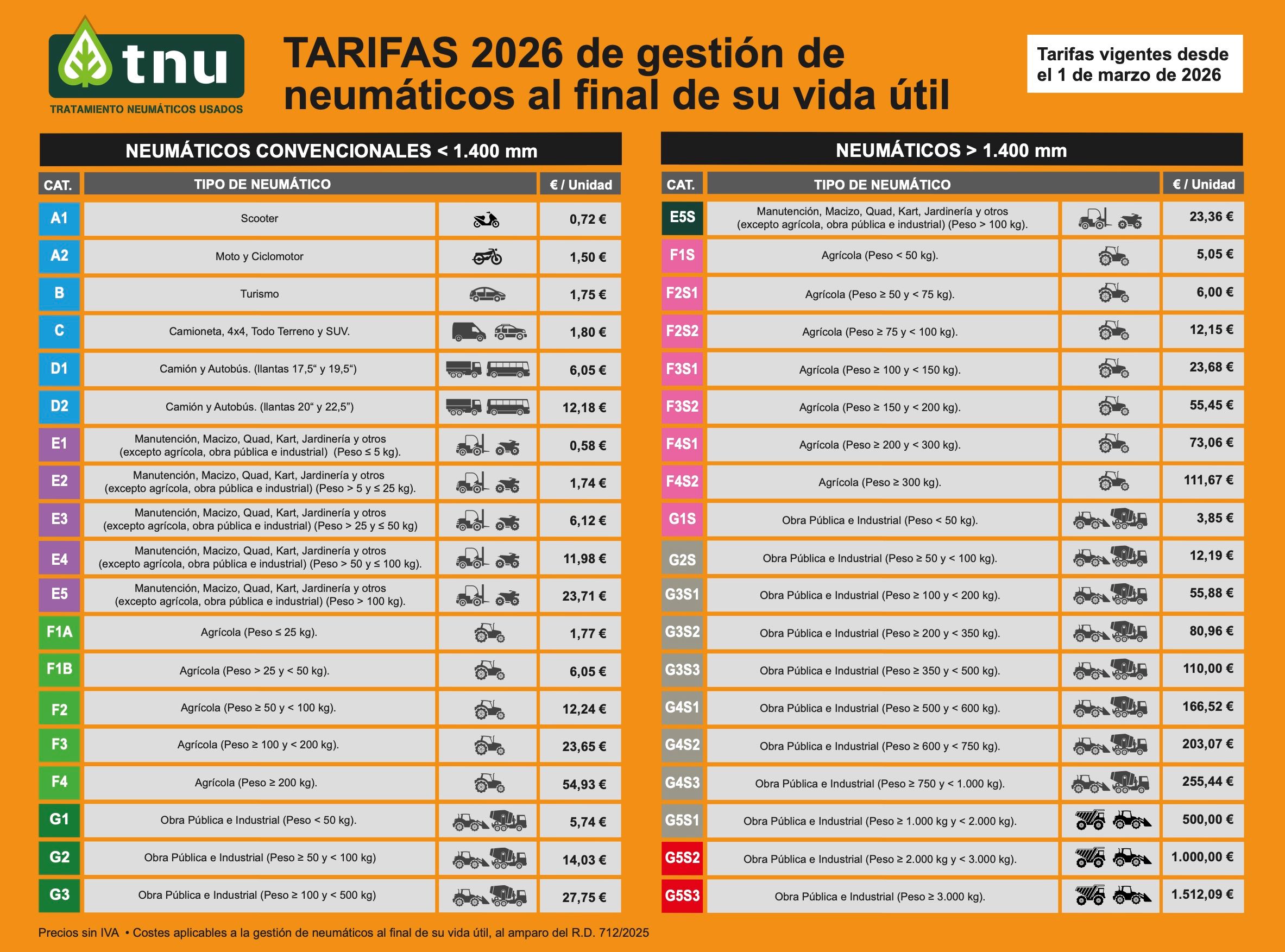 Tratamiento Neumáticos Usados, S.L. (TNU) ha anunciado la aprobación y publicación de las nuevas tarifas de gestión de neumáticos al final de su vida útil, que entrarán en vigor a partir del 1 de marzo de 2026. Este ajuste responde al incremento de los costes de gestión y tiene como objetivo garantizar los recursos financieros necesarios para que el sistema cumpla con sus obligaciones en materia de responsabilidad ampliada del productor.