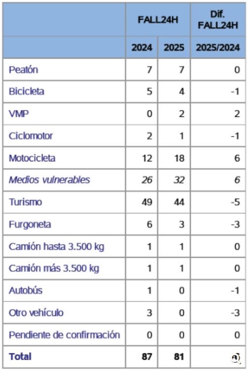 Si tenemos en cuenta el medio de desplazamiento, este mes han aumentado los usuarios vulnerables fallecidos, con 6 personas más que en noviembre de 2024, destacando especialmente el aumento de los motoristas, con 5 fallecidos más, y de los usuarios de VMP, con 2 más que en el mismo mes del año pasado.