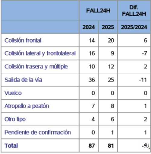 En función del tipo de siniestro, aumentan los fallecidos por colisiones frontales, traseras y múltiples (8 fallecidos más) y por atropello (1 fallecido más), mientras que se reducen en 7 personas los fallecidos por colisiones laterales y frontolaterales y en 11 personas los fallecidos por salidas de vía.