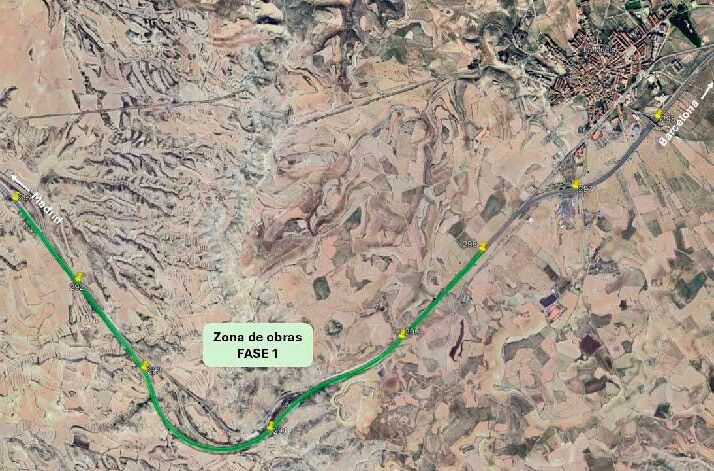 Para la ejecución del tramo comprendido entre los km 292 y 296 de la calzada en sentido Barcelona, a su paso por la localidad zaragozana de La Muela y que se van a realizar la semana del 12 al 16 de mayo, será necesario un corte total de la calzada sentido Barcelona de manera que se reconducirá a los vehículos a la calzada sentido Madrid.