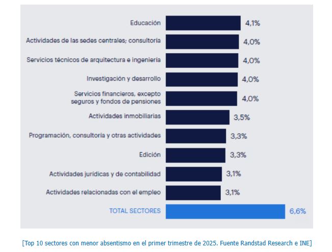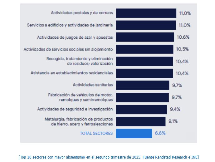 Así, las actividades que presentan un mayor absentismo son Actividades postales y de correos (11%), Servicios a edificios y jardinería (11%), Actividades de juegos de azar y apuestas (10,6%) y Actividades de servicios sociales sin alojamiento (10,5%). Por el contrario, las actividades con menor absentismo son Actividades relacionadas con el empleo (3,1%), Actividades jurídicas y de contabilidad (3,1%), Programación, consultoría y actividades relacionadas con la informática (3,3%) y Edición (3,3%).