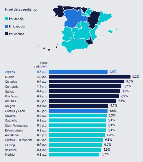 Por comunidades autónomas, Murcia y Canarias son las que registran un mayor absentismo en el tercer trimestre de 2025, con un 9,2% y 8,5%, respectivamente. Tras estas dos comunidades, se sitúan Cantabria (8,2%), Galicia (8%) y País Vasco (7,9%), todas ellas muy por encima de la media del conjunto del mercado laboral. Los menores niveles de absentismo se dieron en Comunidad de Madrid (5,7%), Baleares (5,9%), La Rioja (6%) Castilla-La Mancha (6,1%) y Andalucía (6,3%). Castilla y León se sitúa en la parte media de la tabla, en cifras similares a Aragón (6,7%) y Navarra (6,5%).